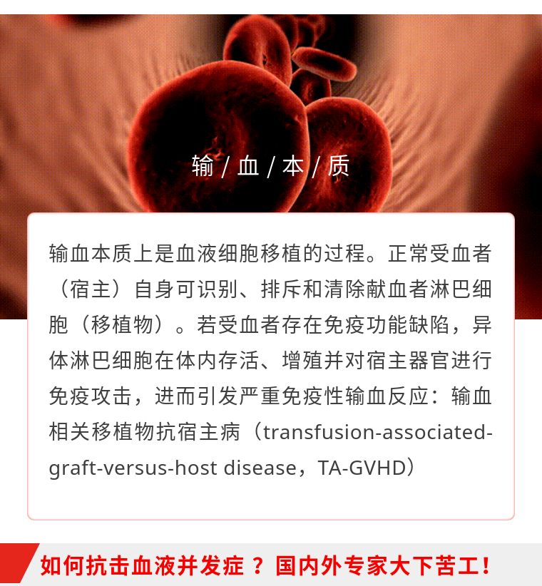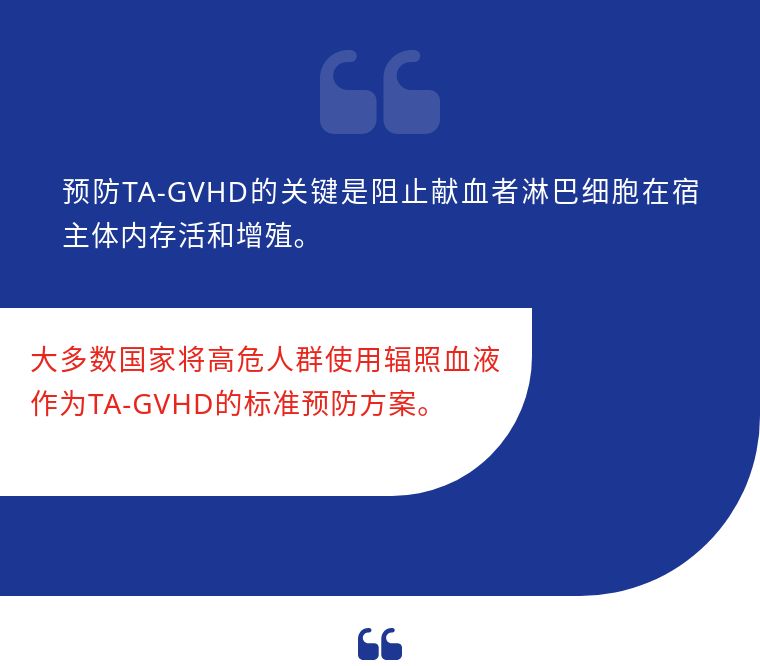 TA-GVHD发病率不高(0.01%~0.1%),但死亡率高达90%~100%。TA-GVHD因其临床表现没有特异性,极易误诊和漏诊,发病迅猛,导致发生TA-GVHD的患者几乎只能接受死亡的现实。国内外专家都在治疗上大下苦工,用药物或者骨髓干细胞移植,但都是收效甚微,没有一种药物或者治疗手段可以在TA-GVHD发生后得到有效控制。该病(TA-GVHD)目前公认的还是防大于治。 目前唯一有效,得到国内外统一认可的方法就是对血液进行辐照后再行输注。这样可以有效避免TA-GVHD的发生。