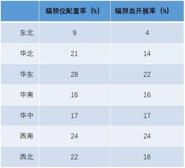 基于以上γ射线辐照仪的诸多弊端,多年来国内开展血液辐照的医疗机构并不多,据输血服务蓝皮书(2019版)统计,血液辐照仪的配置率普遍不高,而且部分血站安装了设备并未开展辐照业务,血液中心开展率42%,中心血站开展率仅为10%。在所有成分制备项目中开展率最低。以下为各区域情况: